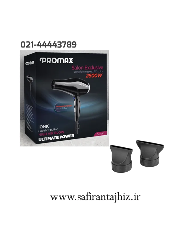 سشوار جدید(2025) و حرفه ای برند پرومکس مدل 7280 :موتور سنگین AC 2800W/دارای تکنولوژی آیونیک دائمی/مناسب برای استفاده حرفه ای سالنی و براشینگ/دارای دکمه کول شات(خنک سازی سریع هوا)/بدنه مقاوم و زیبا /2سرعته با 3حالت دمای قابل تنظیم/2عدد متمرکز کننده باد/و...